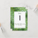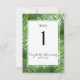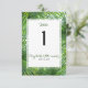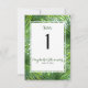 En modern bröllopsdesign för en bröllopsfest, ett elegant bordskort med frodig tropisk grönska, som ramar in ett mallområde anpassat med era namn i modernt typsnitt, datumet och ett stort bordnummer.