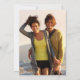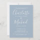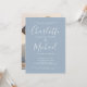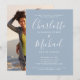 Med namn i signaturstil är denna eleganta, moderna och enkla bröllopsinbjudan personlig med din information i chic vit bokstavsgestaltning på en dammig blå bakgrund och ditt speciella foto på baksidan. Designad av Thisisnotme©