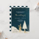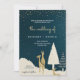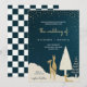 Elegant bröllopsinbjudan med guldfärgade hjortar och träd på en mörk teal bakgrund, med text för Richards och Sophias evenemang. Baksidan är enfärgat teal.