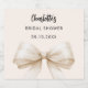 En krämfärgad, beige bakgrund. Dekorerad med en stor rosett. Personlig och lägg till brudens namn och ett datum. Svart handskriven stilmässig skrift.