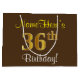 Den här enkla presentsäcksdesignen i eleganten innehåller ett personlig som "Namehär's 36 Birthday!" (med "36:e" som har ett utseende som liknar guld-utseende i utseende på en brunt färgad). Namn är i skriptliknande gult-färgad och kan anpassas. En sådan här personlig-födelsedagspressning skulle kanske kunna användas när en present eller gåva till någon som firar sin trettiosjätte födelsedag är ge. [~Z0000262]