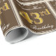 Denna enkla och eleganterna pappra utformning har ett meddelande om personlig som "Namn-här's 43:e födelsedag" (med "43:e" som har ett utseende som påminner om guld-) inom en fyrkantig yta med bruna färgader med en enkel gräns-kontur. Namn är i en elegant som är skript som liknar den vita färgaden och kan vara personlig. Att packa pappert som detta skulle kanske kunna användas när man fyller på födelsedagskalkyl för någon som firar sin fyrtiotredje födelsedag. [~Z0000223]