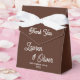 Välkomna till din elegant, personligt bröllp-favoritboxar som gör dina gäster tidlösa. De här vackra favoritrutorna har ett chic brunt skriptteckensnitt med namn och bröllop tryckt på dem. De är perfekten till att en hjärtlig gåva och ett bestående minne från din speciella dag.