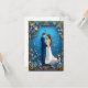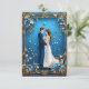 En romantisk skildring av ett brudpar som poserar ömt, omgivet av intrikata blå och gyllene blomsterdekorationer, som fångar en atmosfär av elegans och firande.