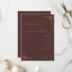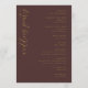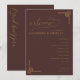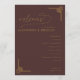 Detta eleganta bröllopsprogram har en rik, djupbrun bakgrund med guldfärgade accenter som skapar en lyxig och sofistikerad känsla. Layouten är vertikal och visar upp en balanserad hierarki av textelement, inklusive kursiv stil för välkomstmeddelandet och rena serif-teckensnitt för ceremonidetaljerna. Dekorativa geometriska motiv i guld tillför traditionell elegans till hörnen och förstärker den formella och klassiska stilen. Perfekt för en tidlös firande, förmedlar denna design värme och formalitet, vilket gör den ideal för betydelsefulla livshändelser som bröllop.