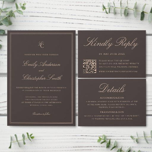 Skapa dina egna bröllops-svarskort med elegant typografi i brun färgtema. Innehåller skannbar QR-kod för dina gäster att svara på din webbplats.