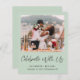 Elegant budgetvänlig salvia grön vigsel eller mindre bröllopsinbjudan och efterbröllopsfest eller celebrationsfest inbjudan. Framsidan visar ert foto, "Fira med oss" i ett elegant skrivsätt och era förnamn och bröllopsdatum och plats i modern typografi. På baksidan kan du anpassa din vigsel eller bröllopsinbjudan mer detaljerat, lägga till en efterfest eller party inbjudan och underteckna era efternamn som gifta i ett signaturliknande skrivsätt.
