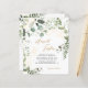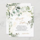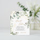 Designdetalj grönska eukalyptus vattenfärg med blommande guldfärgade glitterelement. Använder elegant kalligrafifont i guld för namnet på bruden och brudgummen som får det att sticka ut.