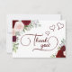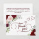 Tacka era bröllopsfestgäster med dessa vackra och genomtänkta kort. Designen har en mängd handmålade akvarellrosor i nyanser av burgunderrött, rött och rosafärgat samt trädgårdsgrönska och eukalyptus. Framsidan av kortet har texten Tack i elegant modern script med svängar och flourishes, samt tre söta och romantiska hjärtan. Baksidan har plats för ett personligt meddelande och din signatur. Ett vackert sätt att uttrycka din tacksamhet medan du och dina vänner ser fram emot er bröllopsdag!