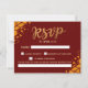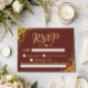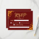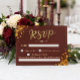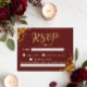 Gör det så enkelt som möjligt att svara på din bröllopsinbjudan med detta sofistikerade burgunderröda och gyllene geometriska svarsbrev. Designad med en djupröd bakgrund och lyxiga gyllene accenter kompletterar detta kort perfekt ett elegant eller hösttematiserat bröllop. Gästerna kan enkelt bekräfta sin närvaro samtidigt som de tillför en touch av klass till din bröllopspapeteri. Personifiera det med dina föredragna svarsdetaljer för att säkerställa en smidig svarprocess.