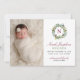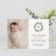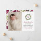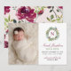 Det här vackra julkortet för födelseannonsering presenterar din söta lilla flicka med ett nyfödd-foto intill en blomstergrönsaksvattenfärgskrans med anpassad burgunder-/vinröd monograminitial och text som kan anpassas för att visa ditt barns namn i skrivstil, tillsammans med viktig födelseinformation och föräldrarnas namn. En koordinerad blomster vattenfärgdesign med rosor och grönska, i en fantastisk vinterpalett av burgunder-/vinröd, merlot, blekrosa och olika gröna nyanser, klär upp baksidan av kortet.