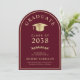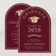 Elegant bågformad burgunderröd universitets examensannonsering och festinbjudan med en gul examensmössa och modern enkel gul typografi för examen kandidatens namn, examensår, universitet eller högskola, examen och huvudämne eller utmärkelser. På baksidan, lägg till detaljer om fests firande.