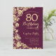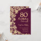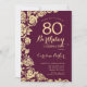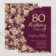 Burgundy guld blommigt 80 födelsedagsfest inbjudan. Elegantens utformning med ro, faux guld-folie och typsnitt för typsnitt. Trendig inbjudan-kortets perfekt för en snyggt kvinnlig dag firande. Kan anpassas till vilken ålder som helst. Skrivna Zazzle-inbjudningar eller digital utskrivbar mall för omedelbar nedladdning.