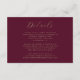 I den här eleganten finns det ett kort för modern bröllop-information i höljet med guld-färgad i en burgundisk bakgrund. Titeln visas i ett vackert handskriftsskript, med anpassadet nedan i sans serif-teckensnitt. Baksidan är massiv burgundi.