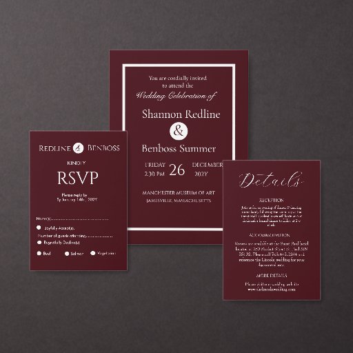 Complete your wedding suite with this Elegant Burgundy Minimalist Wedding Enclosure Card. Designed in a deep burgundy tone with clean white typography, this insert card is perfect for sharing essential details such as accommodations, directions, registry information, reception notes, or itinerary details.