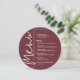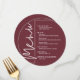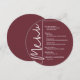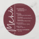 En rund burgundy meny för middagar presenterar dina menyval med elegant vit text, perfekt för en modern bröllopsfest, middag inför bröllopet, årsfest eller någon speciell tillställning med en sittande middag. Anpassa enkelt med dina middagsval och detaljer. FLER färger i vår butik.