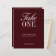 Följ med dina gäster med stil med den här eleganten-burgundssignalen "Ta ett" bröllop. Designad med djup vin-röd bakgrund och förfinad serif-parad med skripttypografi är det perfekten som tillägg till din tjänst eller presenten bord. Det här är ett tecken på att gästerna i inbjudan tar en väska eller en tjänst på vägen ut, vilket gör att du kan lägga till både funktioner och sofistikering i din mottagningsorder. Den här utformningen är perfekt för formella ceremonier i bröllop, vinodlingar, höstceremonier i firande och kvällsceremonier, och är helt och hållet anpassade - personliggör med namn, bröllop-datum eller ett anpassningsbar-meddelande. Koordinerar sömlöst med fullt "Sabrina" bröllop-stationens svit för ett polerat och sammanhängande utseende.