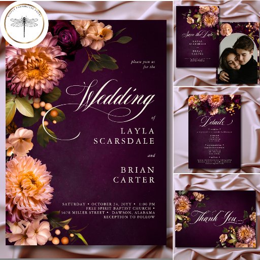 Elegant Burgundy Moody Floral Script WeddingDesignad av Kathe Santillo
