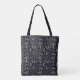 A gorgeous tote bag which has a pattern of delicate butterflies, mushrooms, crescent moons and botanicals in a dark palette of deep blue, purple, gold, red and green.