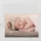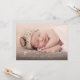 Det här elegantens födelsemeddelande innehåller ett stort fullt-blekt foto på framsidan. Vitt kalligrafiskt skript som läser "välkomstskript" överlägger fotot. Under kalligrafibrevet kan man lägga till baby, namn, födelsestatus och föräldrarnas namn. Kortets baksida kan redigeras - du kan ändra neutraltens grått-bakgrund färg, lägga till ytterligare foton och skriva ett anpassningsbar-meddelande.