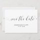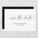 En typografi Spara datumet med svart kalligrafi med dekortecken och hjärtan över en vit bakgrund. Baksidan är svart och kan ändras till valfri färg. Den enkla och minimala layouten och mängden öppet utrymme ge är en modern känsla och kalligrafitexten och hjärtat ge är en romantisk vändning.