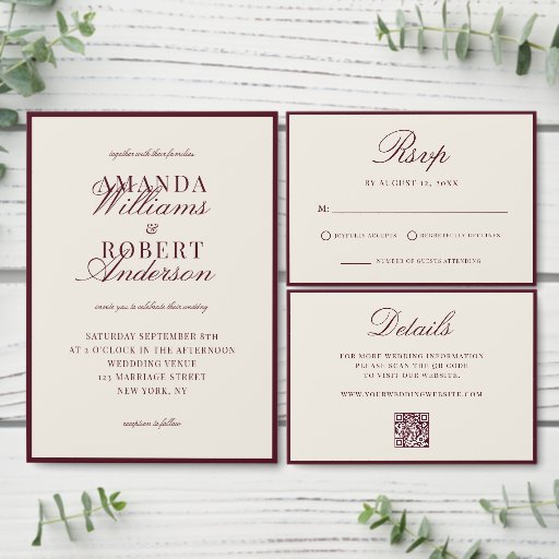 Create your own custom wedding invitations in a luxury old money aesthetic. Add your personalized details and details of your wedding day in elegant, timeless typography featured here in burgundy and cream color design.