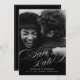 Elegant Calligraphy Classic Bröllop spara datum. En elegant klassisk bröllop-design med kalligrafitext för vitt flytande skript som "Spara datum".