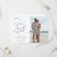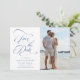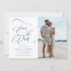 Romantiskt dammigt blått bröllop spara datum med elegant och romantisk kalligrafi med foto. Perfekt för alla säsonger. Om du vill ha en mer avancerad anpassning av den här designen klickar du på BLUE DESIGN VERKTYG ovan!