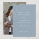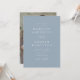 Inbjudningar i elegant bröllop som innehåller uppgifter om namn och bröllop i vita bokstäver med dammig blå bakgrund. Ett modernt kalligrafi-skript kompletterar den här chicens dammiga blå bröllopsinbjudan. Inbjudan går tillbaka till visningen av ditt favoritfoto på förlovningen. Den här enkla inbjudan till fotobröllop är perfekt för både formell och avslappnad bröllop av vilken säsong som helst.
