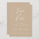 Vår enkla och elegant taupe Save the Date bröllop-kort är perfekt för ert minimalistiska bröllop firande. Ett vackert par med vitt calligrafteckensnitt med enkel och ren text på en mjuk taupbakgrund ger ett förhöjt utseende som kompletterar snyggten. Enkel och snabb att anpassa dig med din egen händelseinformation för namn och bröllop.