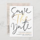 Elegant - enkelt svart och guld bröllop spara datum-vykort. Utformningsfunktioner för att ''spara datumet'' i moderna kalligrafskript i djup svart och guld färg på vit bakgrund. Lägg till ditt meddelande, foto och mer information på baksidan. Alla reserverade Höger ©MSJ_DESIGNS