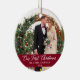 Elegant Calligraphy Script Vår första julfoto Burgundy Ornament med Snöflingor tillbaka - Perfekt för ett Bröllop-foto eller par-foto