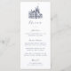 This elegant wedding menu features a vintage illustration of a castle, which you can replace with an image of your destination wedding venue. Dark blue serif lettering lays out the options for starters, main course, and dessert, with script headings.