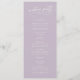 Det här eleganten är ett platt bröllopsprogram för lila av lavendel som är perfekt för ett enkelt bröllop. Den moderna minimalistiska designen har en tidlös pastelllavendelns lila och romantisk kalligrafi med bohemisk saga stil, perfekt för ett vår- eller sommarträdgårdsbröllop. Anpassa din bröllopsprogram med parets namn, datum och plats för bröllop, tack, serviceordning, bröllopsfest och ett minnesmärke "i kärleksfullt minne" som tillval.