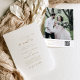 De här elegant-guld-bröllopsinbjudningarna med OSA är perfekt för ett enkelt bröllop. Den moderna minimalistiska designen har vit och tidlös romantisk kalligrafi i guld med bohemisk saga stil. Anpassa dina bröllopsinbjudningar med parets första initialer på framsidan och en förlovning bild och QR-kod för detaljer och RSVPing på baksidan av kortet.