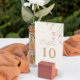 Ett fristående bordsnummer-kort med delikata illustrationer av vilda blommor.