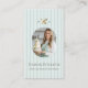 Visa upp ditt bageri eller hembak med stil med hjälp av denna Elegant Chic Bakery Photo Business Card Template av ©Moodthology Papery. Framsidan har en modern mintgrön randig bakgrund med en lekfullt veckad fotoram - perfekt för ditt företagsporträtt. En raffinerad guldpisk och rosa rullningsstångsgrafik, tillsammans med din personliga monogram, ger en touch av sofistikering. Anpassa enkelt med ditt företagsnamn och slogan. Baksidan visar dina kontaktuppgifter i en ren, modern layout och innehåller utrymme för tre ytterligare foton för att visa upp dina läckra skapelser. Perfekt för hembakare, bagerier, kaféer eller restauranger som vill ge ett minnesvärt, professionellt intryck.