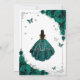 Emerald grönt, silver och White Quinceanera firande inbjudan. Med brunettflicka i boll-klänning, skript, silver-fjärilar, grönt ro och tiara. Perfekt för en elegant prinsessan stil glam firande. Anpassa med dina egna detaljer. Skrivna Zazzle-inbjudningar eller digital utskrivbar mall för omedelbar nedladdning.
