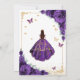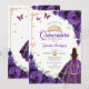 Inbjudan till lila, guld och vita Quinceanera firande. Med brunettflicka i boll-klänning, skript, guld-fjärilar, lila ro och tiara. Perfekt för en elegant prinsessan stil glam firande. Anpassa med dina egna detaljer. Skrivna Zazzle-inbjudningar eller digital utskrivbar mall för omedelbar nedladdning.