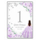 Lilac purple silver and white Quinceanera celebration table number cards. Features brunette girl in ball gown dress, script font, silver butterflies, roses and tiara. Perfect for an elegant princess style glam celebration. Personalize with your own details.