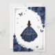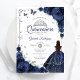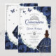 Inbjudan till marinblått, silver och vitt Quinceanera firande. Med brunettflicka i boll-klänning, skript, silver-fjärilar, ro och tiara. Perfekt för en elegant prinsessan stil glam firande. Anpassa med dina egna detaljer. Skrivna Zazzle-inbjudningar eller digital utskrivbar mall för omedelbar nedladdning.