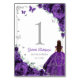 Purple silver and white Quinceanera celebration table number cards. Features brunette girl in ball gown dress, script font, silver butterflies, purple roses and tiara. Perfect for an elegant princess style glam celebration. Personalize with your own details.
