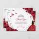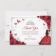 Red silver and white Quinceanera thank you card. Features brunette girl in ball gown dress, script font, silver butterflies, red roses and tiara. Perfect for an elegant princess style glam celebration. Personalize with your own details.