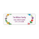 En familjs adressetikett för anpassningsbar av snyggt (kan även anpassas för en person), med en blommigt runt det lämnat och höger kant, och med en elegant, contemporary, handskrivet informellt skript för familjen namn eller personens namn.