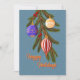 Send warm holiday wishes with this elegant card featuring beautifully decorated Christmas ornaments hanging from a pine branch. The design showcases vibrant red, blue, and gold ornaments against a softly snowing background, creating a festive and timeless look. Perfect for sharing joy and warmth with family, friends, or coworkers during the holiday season.