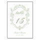 Gracefully designed with a soft sage green floral crest and elegant typography, this wedding table number adds a refined, romantic touch to your reception. Its classic white backdrop and timeless detailing make it special—effortlessly guiding guests while enhancing your tablescape with cohesive, heirloom-inspired style.