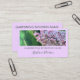 Anpassa det här vackra affärskortet med din egen text. Lägg till ditt eget foto till det här klasskortet eller användan... det här vackra lilac-växtfotot jag tog. Det här fotot-affärskortet är inramat i modern, enkel lila rosa med mörk grönt skript för ditt företag namn eller annan föredragen text. Lägg till ditt företag namn eller yrke och namnteckning anpassningsbar-skript namn. På baksidan kan du anpassa all enkel ren text så att den innehåller din kontaktinformation och ditt motto. Detta skulle vara ett underbart affärskort för en landskapsarkitekt, en landskapsdesigner, florist, trädgårdsmästare, livskassan, terapeut, andlig-ledare, naturterapeut eller professionell utomhus. Det skulle också vara bra att lägga till ett eget foto till en professionell kostym.