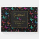 En gästbok för elegant och chic bröllop. Designad med en klass tittar mönster med en grafisk illustration av fjärilar som flödar i många ljusa färger, och kontrasterar mycket träffande mot den svarta bakgrunden. Viktiga blommigtar, spritar och löv tillför lite charm. En svart kvadrat ram med en gräns i färgaden guld överst med personligen inuti. Texten kan också enkelt anpassas till andra händelser i kostym, t.ex. pension och årsdagar.