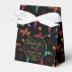Luta små favoritlådor till bröllop. Designad med en elegant mönster med en grafisk illustration av fladderfjärilar i många ljusa färger, som på ett mycket bra sätt kontrasterar mot den svarta bakgrunden. Viktiga blommigtar, spritar och löv tillför lite charm. Ett svart ram med en guld färgad gräns överst med personligen inuti.