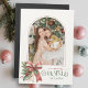 This charming holiday greeting features an elegant arch shaped photo template with thin pink border, sweet watercolor blush pink and ecru coquette style bow with holly and winter greenery and custom Merry Christmas text graphic in coordinating pink and sage green colors.